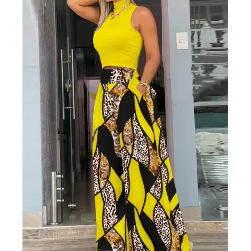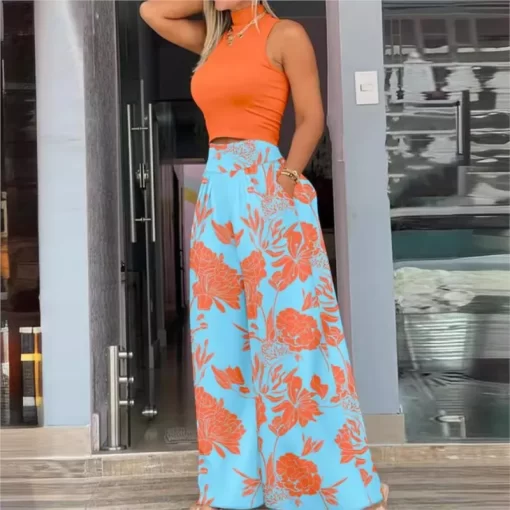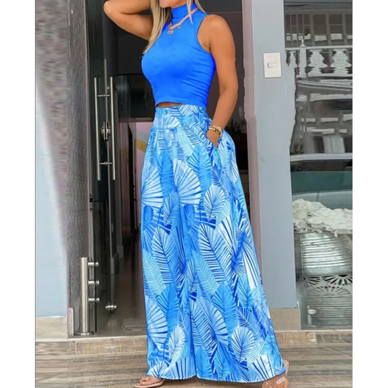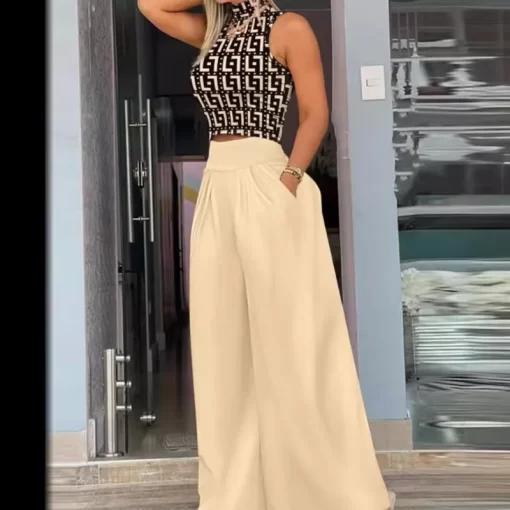 Summer Sleeveless Vest Suit For Women New Fashion Slim Printed Wide Leg Trousers Elegant Female Temperament Office 2 Piece Set